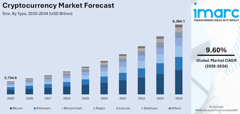 The global cryptocurrency market is no longer just a playground for tech enthusiasts; it has matured into a sophisticated pillar of the modern financial ecosystem. Driven by institutional adoption, the rise of decentralized finance (DeFi), and the tokenization of real-world assets, the market is shifting from speculative volatility toward structural stability. According to IMARC Group’s latest data, the global cryptocurrency market size was valued at USD 2,734.6 Billion in 2025. Looking forward, IMARC Group estimates the market to reach USD 6,394.1 Billion by 2034, exhibiting a CAGR of 9.60% from 2026-2034.